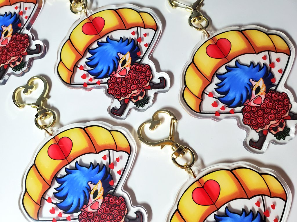 This listing features Adam/Ainosuke from SK8 in his parachute with, of course, a bundle of roses! This design is 3" inches, double sided, and come with a gold heart clasp!